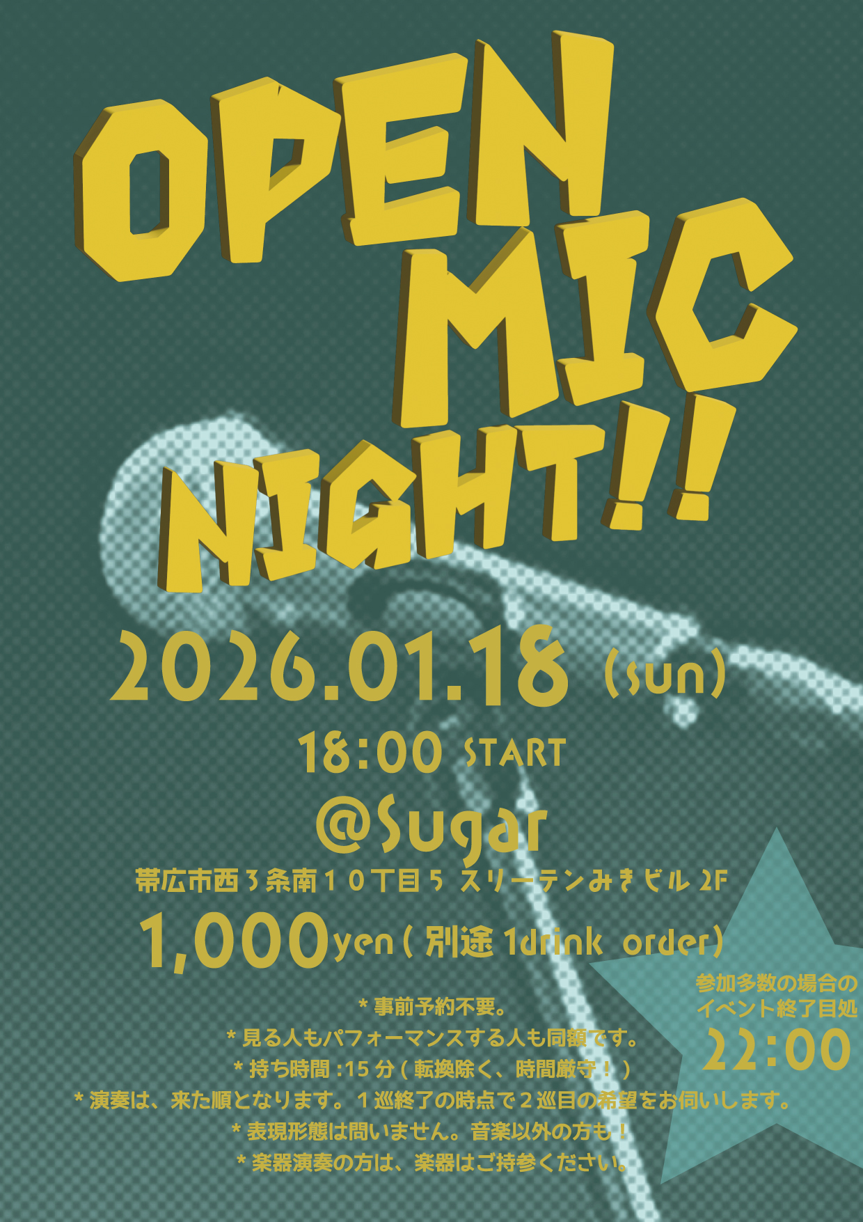 ※「OPEN MIC NIGHT!」は、事前エントリー不要のオープンマイク。きた人から順に、持ち時間は15分。演奏に限らず、公序良俗に反するようなものでなければ、大丈夫です。楽器はなるべくお持ちください。ご希望人数によっては、おかわり(2回目)あり。途中入場、途中退場ご自由に。一度出て戻ってくる場合はお声かけください。
